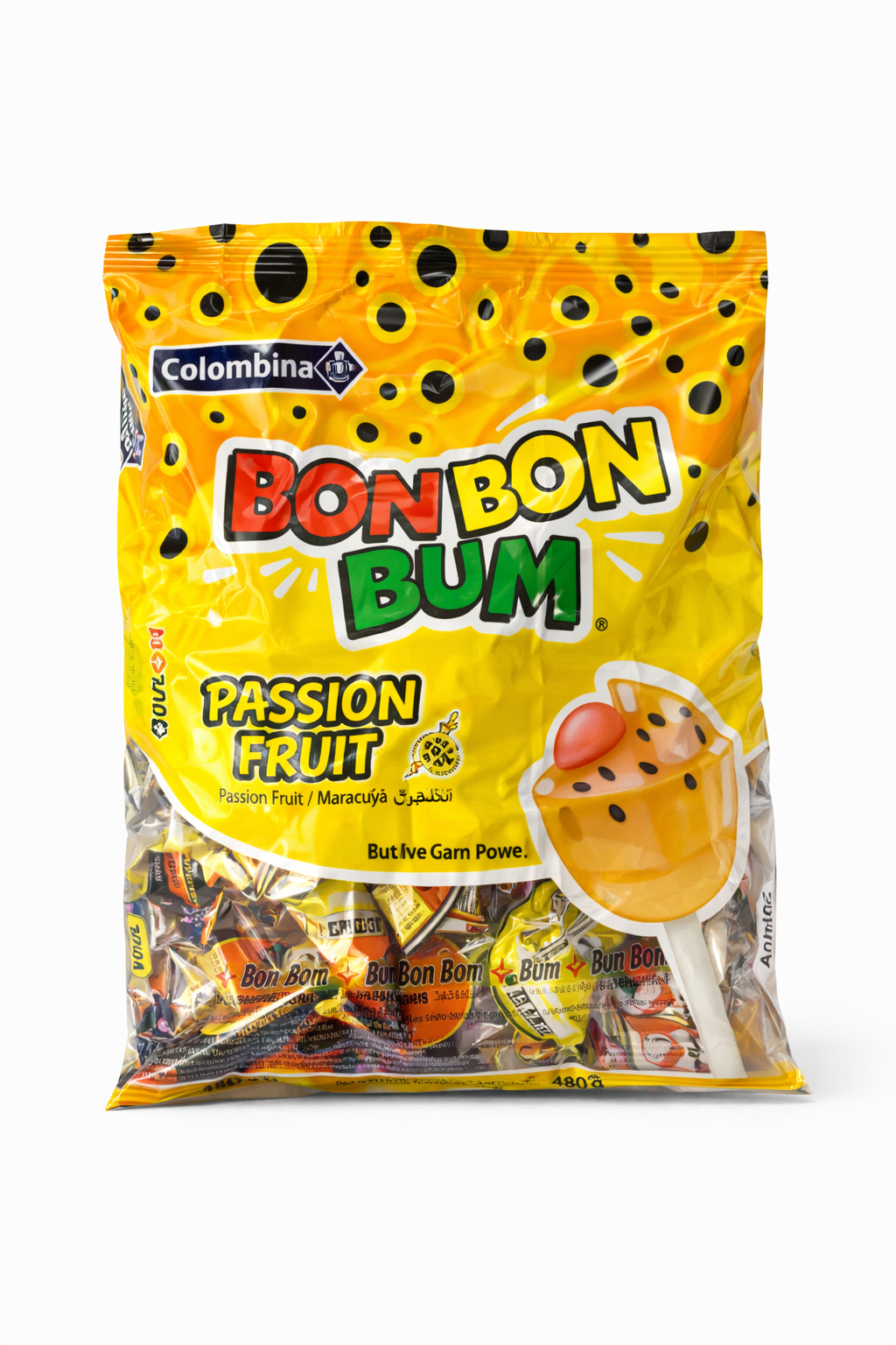 Bolsa de chupetines bon bon bum de maracuyá   480gr – 24 unidades